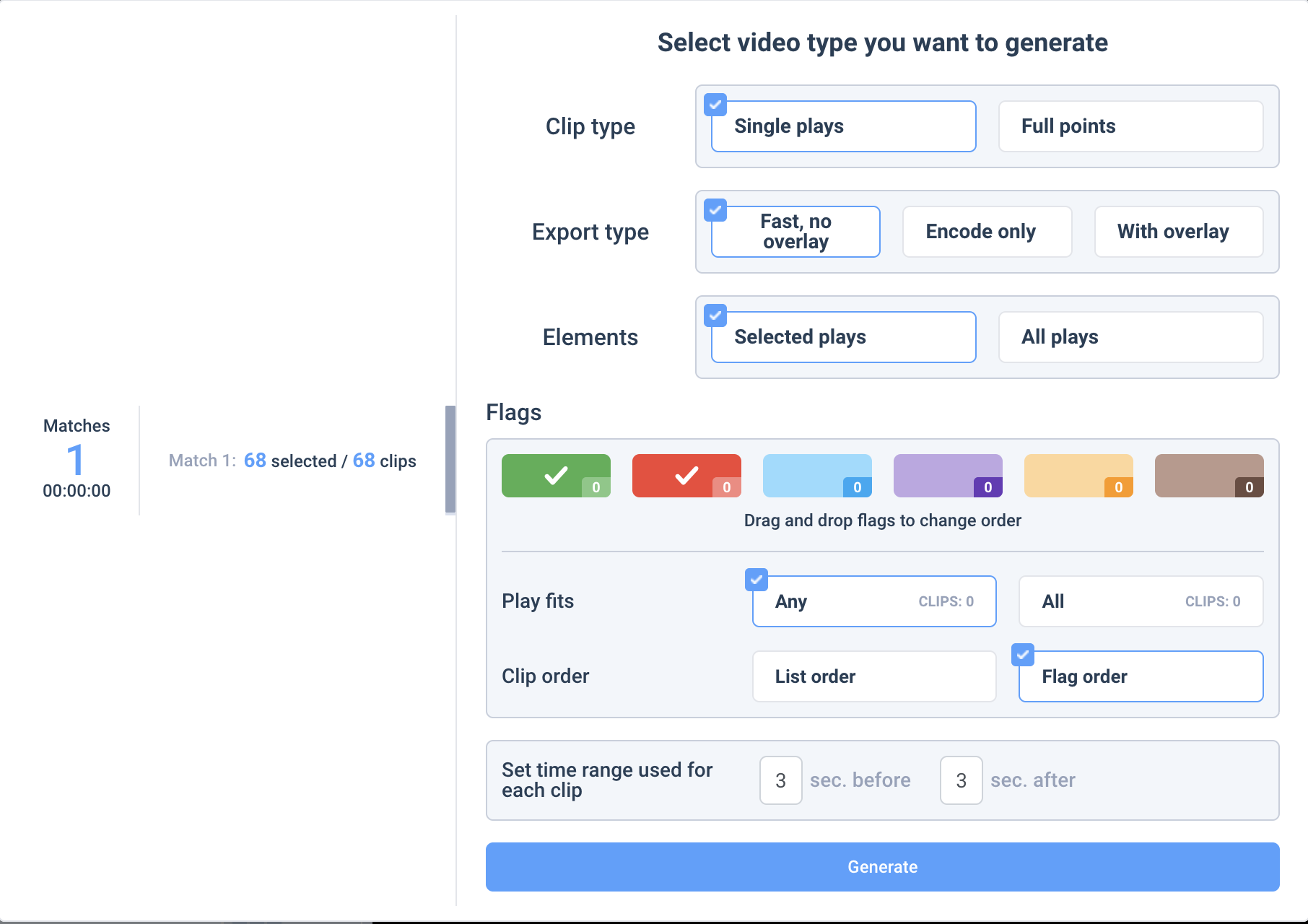You can export just flagged clips. When you press Export, click on the color of the flag you want to export. You can select multiple flags and determine if you want plays to fit any of the flags or all of them at the same time. You can also select the order of the clips. Check the image below: